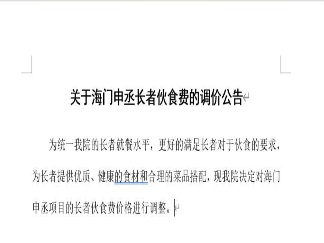 為統(tǒng)一我院的長(zhǎng)者就餐水平,更好的滿足長(zhǎng)者對(duì)于伙食的要求,為長(zhǎng)者提供優(yōu)質(zhì)、健康的食材和合理的菜品搭配,現(xiàn)我院決定對(duì)海門申丞項(xiàng)目的長(zhǎng)者伙食費(fèi)價(jià)格進(jìn)行調(diào)整。