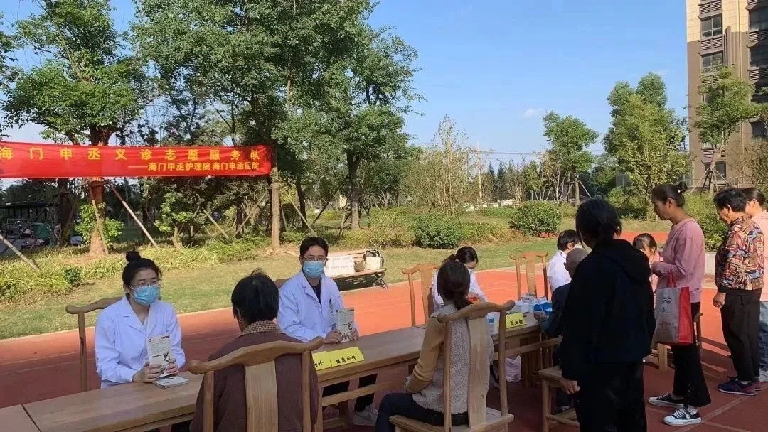 重陽日,海門申丞護理院/海門申丞醫(yī)院的醫(yī)護人員將愛送到證大社區(qū),為小區(qū)居民進行測血糖、量血壓、健康咨詢等義診活動,得到了小區(qū)居民的熱烈歡迎。