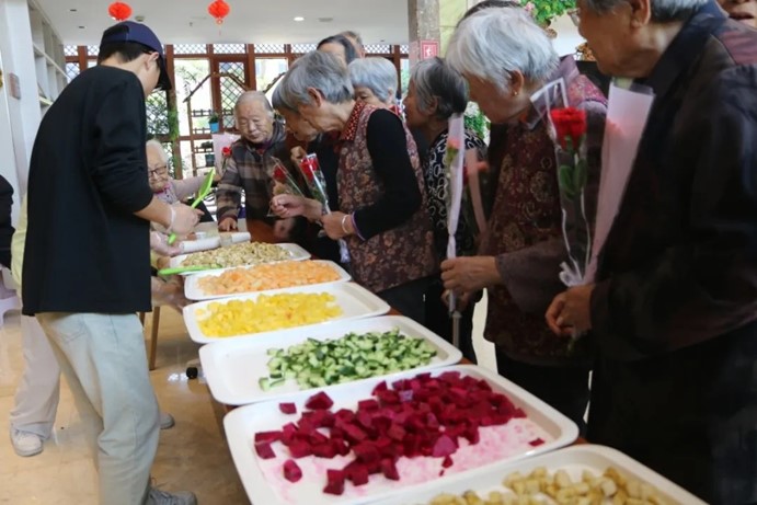 活動現(xiàn)場還準(zhǔn)備了繽紛的水果撈DIY環(huán)節(jié)。哈密瓜、香蕉、菠蘿、火龍果等各種水果,長者們挑選自己喜歡的水果,細(xì)細(xì)品嘗著香甜,坐在椅子上分享著味道,奶奶們笑得無比的甜。