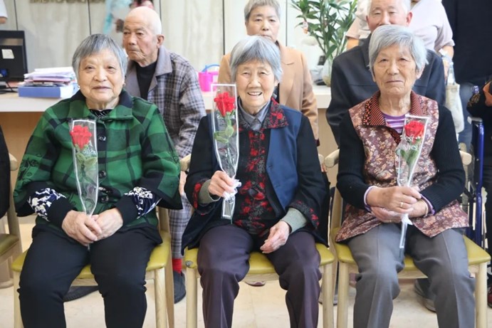 我們?yōu)槊恳晃慌蚤L者獻(xiàn)上海門申丞自制的“永生花”,當(dāng)將花朵輕輕遞到她們手中時,許多奶奶開心得合不攏嘴,嘴里笑著說“好久沒收到花啦”,奶奶們捧著花,各個笑得像個少女。